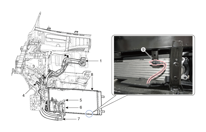 2. Сервисный порт (низкое давление) 3. Сервисный порт (высокое давление) 4. Датчик давления кондиционера (APT) 5. Компрессор |