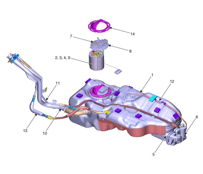 9. Датчик уровня топлива (ДУТ) 10. Топливный шланг 11. Вентиляционная трубка 12. Паровая трубка 13. Выравнивающий шланг 14. Крышка пластины топливного насоса |