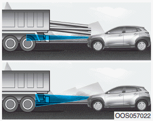 Если впереди идущее транспортное средство имеет груз, который выдвигается из кабины назад, или если перед вами транспортное средство с большим дорожным просветом, дополнительные специальные требуется внимание. Система FCA может быть не в состоянии обнаружить выдвижение груза. от автомобиля. В таких случаях необходимо соблюдать безопасный тормозной путь. от самого заднего объекта и, если необходимо, нажмите на педаль тормоза, чтобы уменьшить скорость движения для сохранения дистанции.