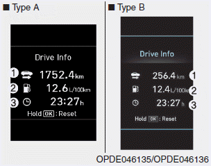 Чтобы вручную сбросить информацию, нажмите и удерживайте кнопку OK при просмотре. Информация о диске. Расстояние поездки, средний расход топлива и общее время вождения сбросятся одновременно.