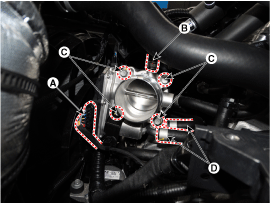 Отсоедините разъем модуля ETC (A), паровой шланг (B), шланги охлаждающей жидкости.