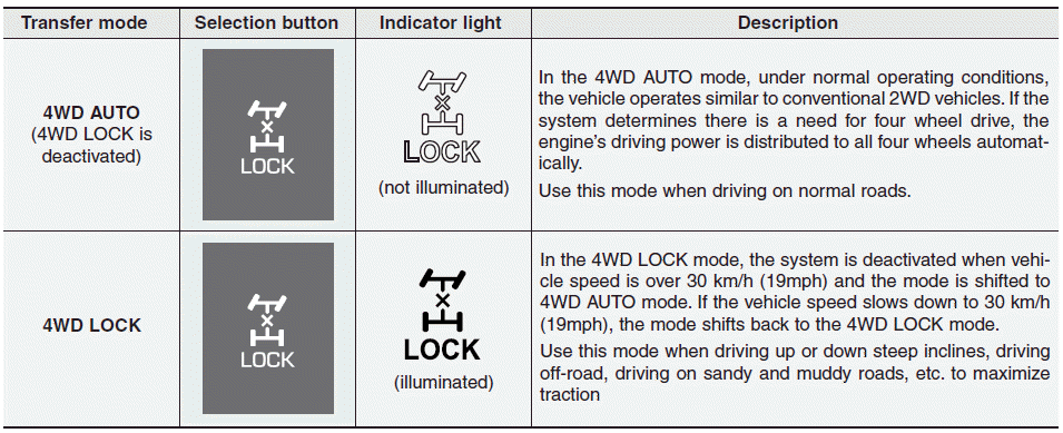 При движении по обычным дорогам отключите режим 4WD LOCK, нажав кнопку Кнопка 4WD LOCK (индикатор 4WD LOCK гаснет). Движение по обычным дорогам с режим 4WD LOCK, особенно на поворотах, может вызвать механический шум или вибрацию. Шум и вибрация исчезнут при деактивации режима 4WD LOCK. Продлить движение с шумом и вибрацией может привести к повреждению некоторых частей силовой передачи.