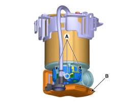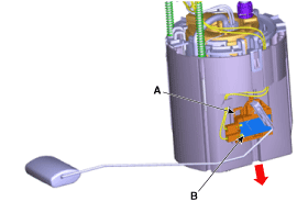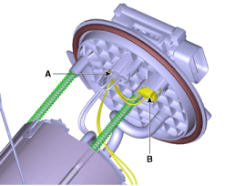 Отсоедините разъем электродвигателя топливного насоса (А) и разъем датчика уровня топлива.