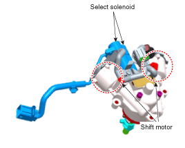 Электродвигатель переключения привода переключения передач и соленоид выбора получают сигналы от TCM