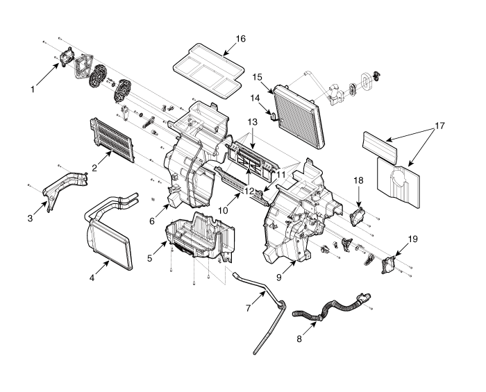 16. Уплотнение центрального воздуховода 17. Прокладка блока отопителя 18. Привод автоматического предотвращения запотевания 19. Привод контроля температуры |