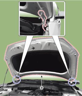 Ослабив болты крепления петли капота (А), снимите капот в сборе.