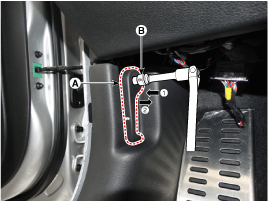 Используя торцевую головку (В), снимите ручку открывания капота (А).