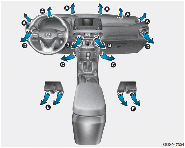 Воздух может быть направлен на пол, отверстия приборной панели или лобовое стекло.