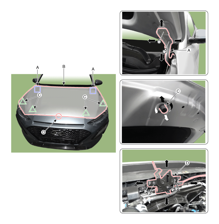 Ослабив болты крепления защелки капота (D), отрегулируйте защелку