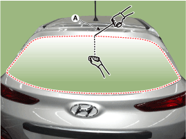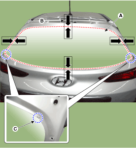 установочные метки (B) на кузове и слегка нажмите на окно задней двери.