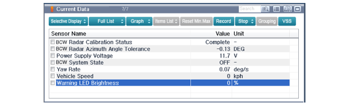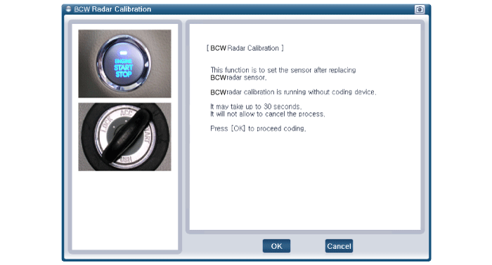 Зажигание «ВКЛ.», двигатель «ВЫКЛ.», выберите систему BCW и «Калибровка радара BCW».