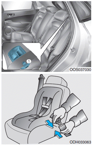 1. Поместите детскую удерживающую систему на заднее сиденье и ремень вокруг или через детскую удерживающую систему, следуя за детской удерживающей системой Инструкции производителя системы. Убедитесь, что лямка ремня безопасности не перекручена. Убедитесь, что ремень вставлен в направляющую (1).