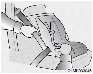 4. Нажмите и потяните детскую удерживающую систему, чтобы убедиться, что ремень безопасности крепко держит его на месте. Если производитель вашей детской удерживающей системы рекомендует использование верхней лямки с поясным/плечевым ремнем, см. стр. 2-38.