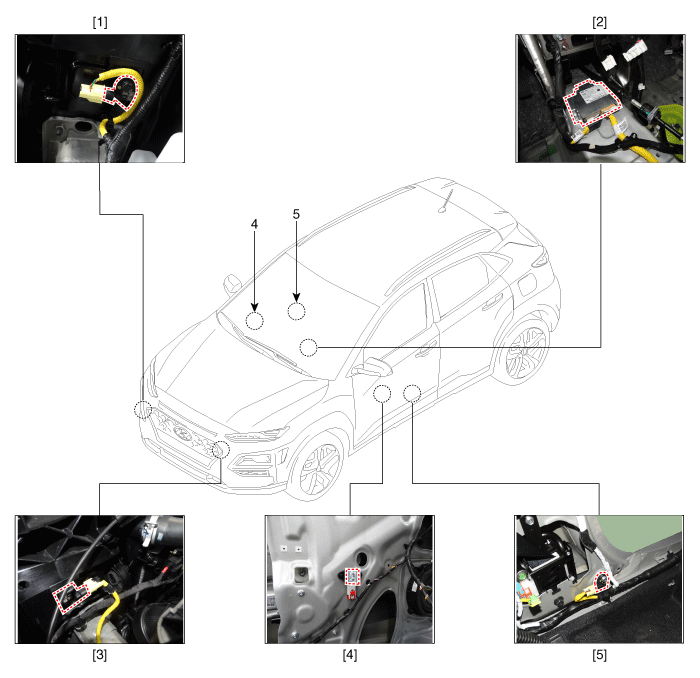 2. Модуль управления дополнительной удерживающей системой (SRSCM) 3. Передний левый датчик давления (FIS) |