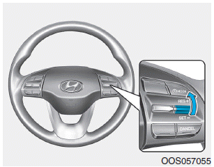 Нажмите тумблер вверх (RES+). Если скорость автомобиля превышает 30 км/ч (20 миль/ч), автомобиль возобновит заданную скорость.