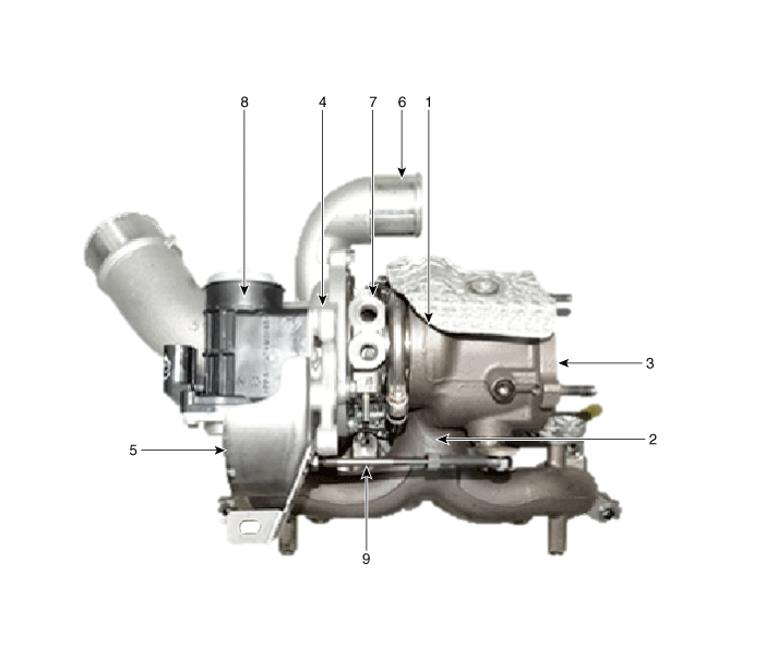 2. Вход в турбину 3. Выход из турбины 4. Корпус компрессора 5. Вход компрессора |