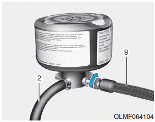 2. Навинтить соединительный шланг (9) на штуцер баллона с герметиком.