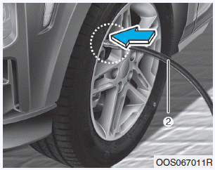 4. Отвинтите колпачок с вентиля неисправного колеса и закрутите заправочный шланг (2) Отсоедините баллон с герметиком ограничения скорости от клапана.