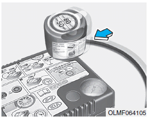 8. Когда ключ зажигания находится в положении ON, включите компрессор и дайте ему поработать примерно 5-7 минут, чтобы заполнить герметиком до надлежащего давления. (см. «Шины и колеса», глава 8). Давление в шине после заполнение несущественно и будет проверено/исправлено позже.