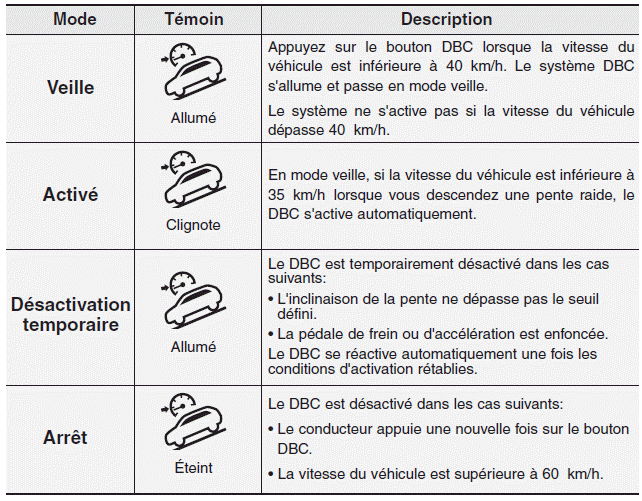 Если загорается красный индикатор DBC WARNING, это может означать, что ваша система перегрелась или неисправна. Когда свидетель загорается, когда система DBC остыла, рекомендуется провести ее обслуживание автомобиль как можно скорее у авторизованного дилера HYUNDAI.