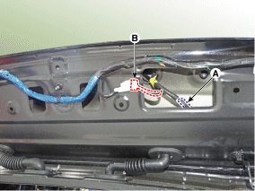 Отсоедините верхний разъем стоп-сигнала (В) и форсунку омывателя.