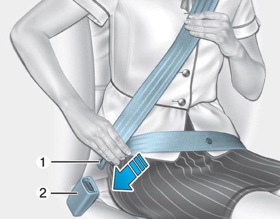 Вытащите его из ретрактора и вставьте металлический язычок (1) в пряжку (2). Слышен щелчок, когда язычок входит в пряжку.