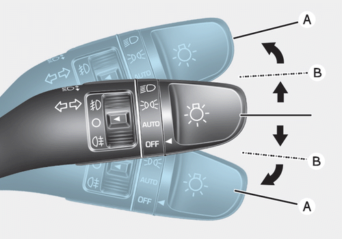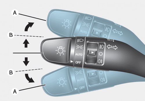 Чтобы подать сигнал о смене полосы движения, замигайте и удерживайте соответствующий сигнал поворота. в положении (В). Рычаг возвращается в исходное положение, когда вы его отпускаете или как только вы повернулись.