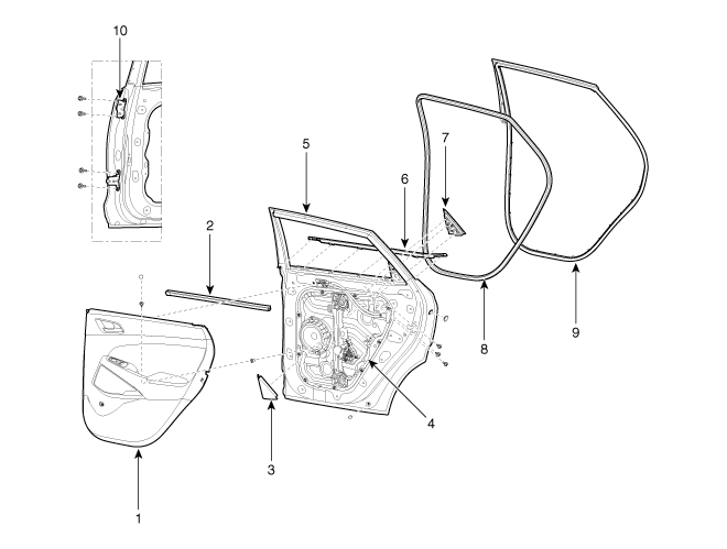7. Наружная крышка дельты задней двери 8. Резинка бокового уплотнителя задней двери. 9. Резина бокового уплотнителя задней двери 10. Петля задней двери |