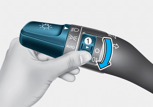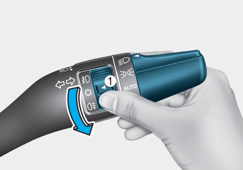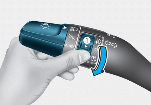 Установите переключатель света в положение ближнего света, затем переключатель противотуманных фар (1) в положение задних противотуманных фар.