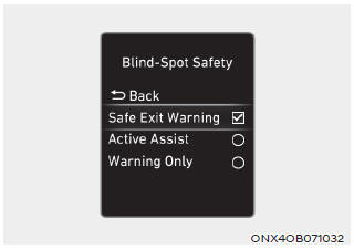 При включенном двигателе выберите «Помощь водителю»> «Безопасность в слепых зонах»> «Безопасный выезд». Предупреждение» из меню «Настройки», чтобы включить на предупреждение о безопасном выходе и снимите флажок, чтобы включить от функции.