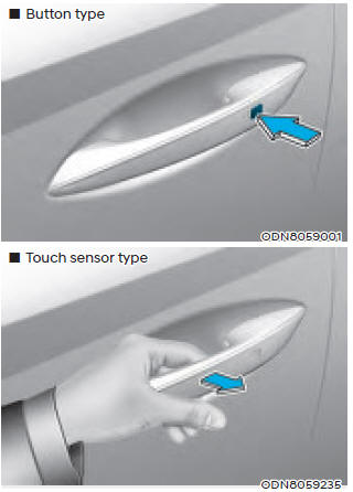2. Нажмите кнопку отпирания двери (2) на смарт-ключ, нажмите кнопку на ручку передней двери или коснуться двери датчик разблокировки в передней двери ручка для разблокировки дверей.