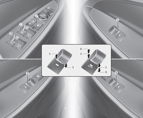 Зажигание должно быть включено, чтобы открывать или закрывать окна. У каждой двери есть переключатель, который управляет стеклоподъемником. Водитель есть кнопка блокировки стеклоподъемника, которая блокирует работы пассажирских окон.