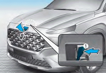 3. Подойдите к передней части автомобиля, слегка приподнимите капот, поднимите вторичный защелку (1) внутри центра капота и поднимите капот.