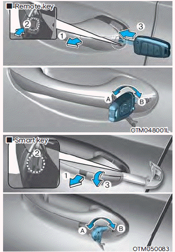 Сначала потяните за внешнюю ручку двери (1) и нажмите на крючок (2), расположенный внутри наружной ручки двери с помощью механического ключа. И снимите крышку (3).
