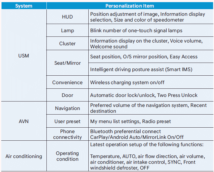 В автомобиле доступны следующие функции персонализации.