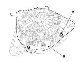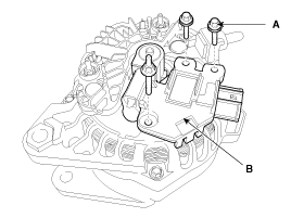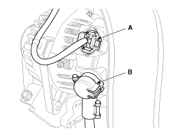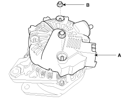 Отсоедините разъем генератора (А) и кабель (В) от клеммы «В» генератора.
