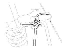 Отсоедините тормозную трубку, ослабив накидную гайку трубки (В).