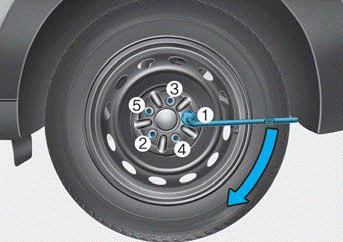 13. С помощью колесного ключа затяните колесные гайки в указанном порядке. Дважды проверяйте каждую колесную гайку, пока они тесные. После замены шин, иметь официального дилера HYUNDAI затяните колесные гайки до упора крутящий момент как можно скорее. Затянуть колесные гайки до 79-94 lbf.ft (11-13 кгс.м).