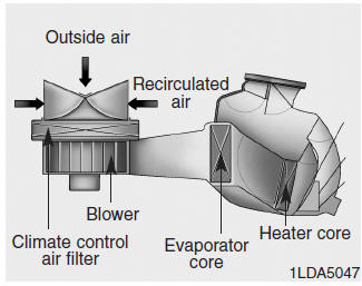 Если пыль или другие загрязняющие вещества накапливаются в фильтре в течение определенного периода времени, поток воздуха из вентиляционных отверстий может уменьшиться, что приведет к скоплению влаги на внутреннюю часть ветрового стекла, даже если выбран режим подачи наружного (свежего) воздуха. В этом случае поручите замену воздушного фильтра климат-контроля авторизованному дилеру HYUNDAI. дилер.