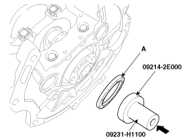 Используя SST (09231-H1100, 09214-2E000) и молоток, вбейте сальник (А) до тех пор, пока поверхность заднего сальника не будет совмещена с цилиндром задняя сторона блока в сборе.