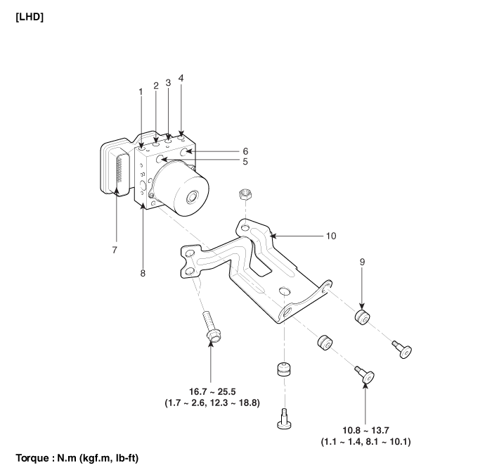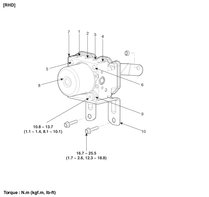 Удаление 1. Выключите зажигание. 2. Отсоедините тормозные трубки от HECU, отвернув гайки против часовой стрелки с помощью гаечного ключа. Момент затяжки : АБС: 12,7 ~ 16,7 Нм (1,3 ~ 1 ...