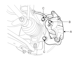Ослабьте рым-болт шланга (B) и крепежные болты суппорта (C), затем снимите передний суппорт в сборе (A).