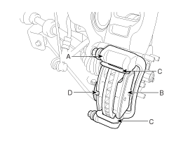 Замените прокладку колодки (D), фиксаторы колодки (C) и тормозные колодки (B) в кронштейне суппорта (A).