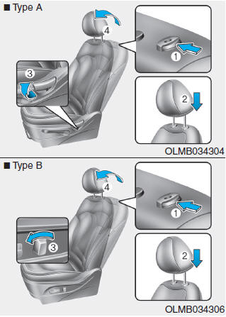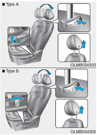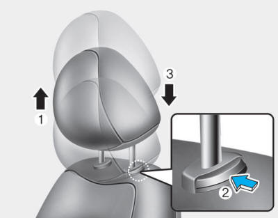 3. Нажмите кнопку фиксатора подголовника (3), потянув подголовник вверх (4).