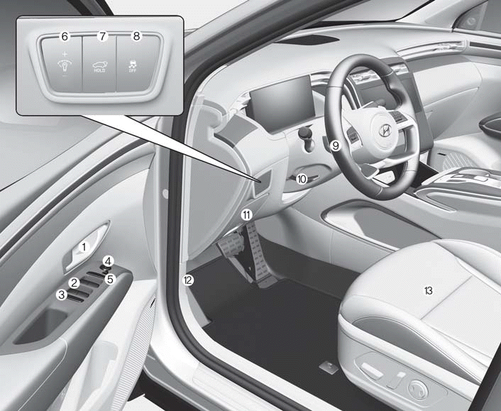 1. Модуль управления ESC (HECU)2. Датчик скорости переднего колеса 3. Датчик скорости заднего колеса 4. Датчик продольного ускорения (только для 4WD)5. Контрольная лампа стояночного тормоза/ EBD6. Контрольная лампа ESC7. Датчик угла поворота руля8. Контрольная лампа ESC9. Лампа отключения ESC10. контрольная лампа DBC