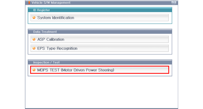 После выбора «модели автомобиля» и «системы» выберите «ТЕСТ MDPS» на экране выбора автомобиля GDS.
