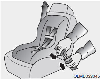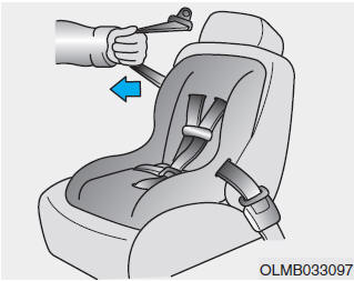 6. Нажмите и потяните детское удерживающее устройство, чтобы убедиться, что ремень безопасности крепко держит его на месте. Если это не так, отстегните ремень безопасности и повторите шаги. со 2 по 6.