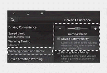 Если приоритет безопасности вождения выбран из меню настроек в информационно-развлекательной системе системы, ваш автомобиль снижает все другие громкость звука, когда водитель Звучит предупреждение системы помощи.