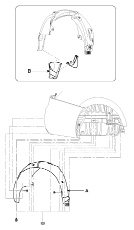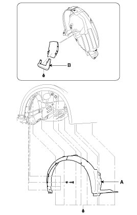 Ослабив крепежные зажимы и винты, снимите передний подкрылок (А), брызговик (В).