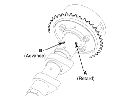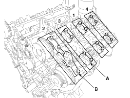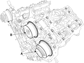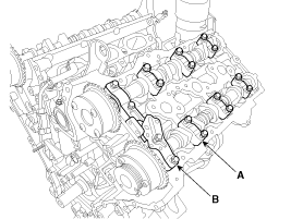 Снимите крышку левого распределительного вала (А) и крышку упорного подшипника (В).